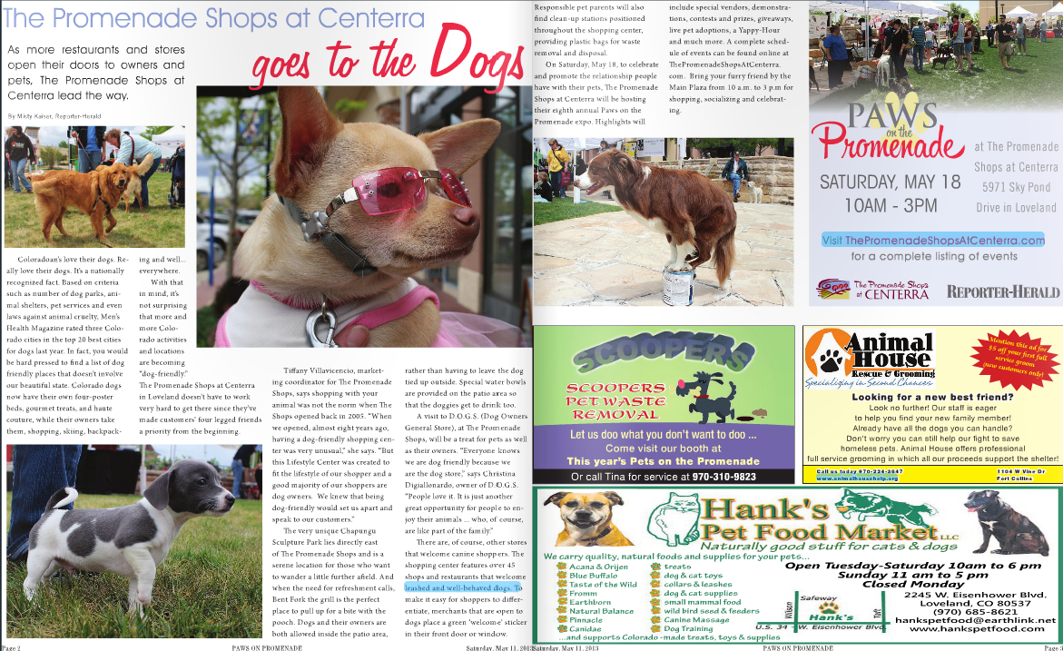 An event guide for a dog-centric event at The Promenade Shops at Centerra in Loveland, CO, for which I wrote the cover article.